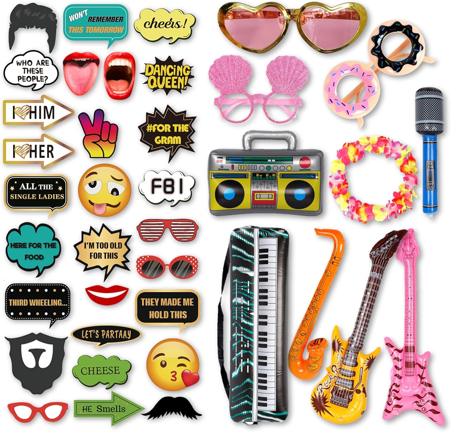 This vibrant photo booth prop kit is designed to bring instant fun, color, and personality to every celebration. Each piece is pre-assembled or easy to set up, crafted with durable materials, and ready to deliver party-ready excitement. From inflatable instruments to bold signs, every item is created to help you capture joyful, memorable moments.